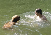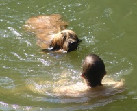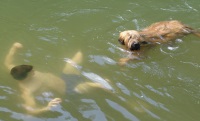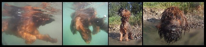 Mein Sportprogramm wurde dann erweitert auf das Schwimmen und ich habe in einem kleinen Badesee mein „Seepferdchen“ bestanden. Es war warm, das Wasser war herrlich erfrischend und als meine Menschen dann im See schwammen, bin ich einfach hinterher! Dass Thomas auf einmal auf dem Rücken schwamm und ich auf ihn „draufschwamm“ und auch für die Kratzer auf seinem Bauch, dafür kann ich nix. Das war bestimmt eine wilde Maus!
