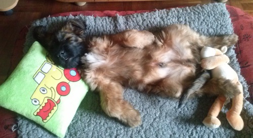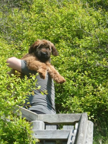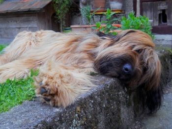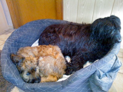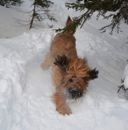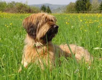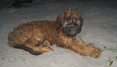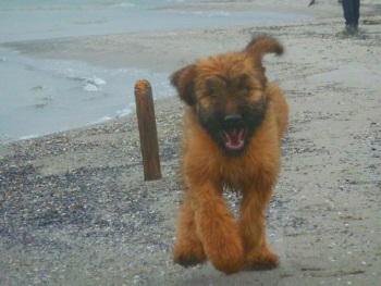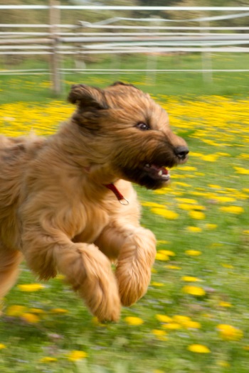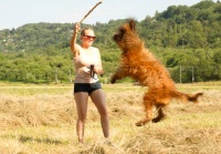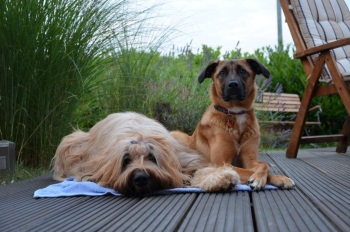 Nach dem Seminar absolvierte ich ein sportliches Trainingslager auf dem Sonnenblumenhof. Meine Trainerin war Zazou. Auf dem Programm standen: rennen über Stock, Stein, durch Tunnel und Sandkiste und das ganze, riesige Gelände. Da gab es Runden über Runden und ich gab mir alle Mühe, mit dem Sportpaket Zazou mitzuhalten. Manchmal nahm ich die Abkürzung, hihi…. Und am Ende eines Trainingstages hatten wir nicht nur das Sportprogramm absolviert, wir haben auch noch aufgeräumt. Und zwar das Welpengehege, das wundersamerweise auf einmal viel kleiner war als früher. Anne und Dieter haben einen großen Haufen frischen Sand in die Sandkiste geschüttet, den haben Zazou und ich emsig im Garten verteilt. Dazu haben wir zwei riesige Löcher bis nach Australien gebuddelt. OK, Zazous Loch war viel schöner als meins und irgendwann habe ich ihr das Loch geklaut… aber das ist eine andere Geschichte. Klauen konnte man nämlich vieles auf dem Sonnenblumenhof: da gab es riesige Knochen, die die restlichen Bewohner nicht brauchten. Die lagen einfach m Garten rum und waren klasse. Böse Zungen behaupteten, dass Oma Erna da lag, aber wenn, dann schmeckte Oma Erna erste Sahne!