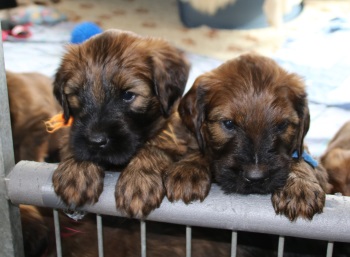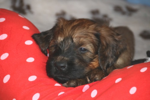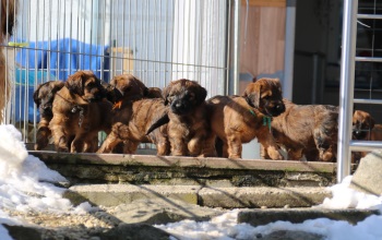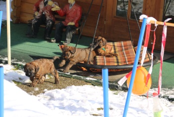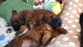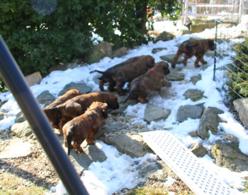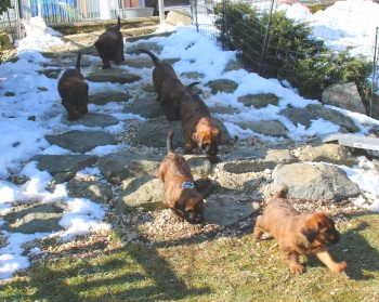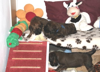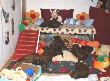 Tagsüber werden die größeren "Geschäfte" bereits überwiegend draußen erledigt - nur einige "Warmduscher" erledigen das doch lieber oben auf der Terasse, wo es wenigstens windgeschützt ist. Nach Spiel und Spaß an der frischen Luft und lecker Essen - sie entwickeln einen beängstigenden Appetit - werden im Haus noch die Plüschis bespielt und dann verabschiedet Hund sich so nach und nach zu einem entspannten Schläfchen.